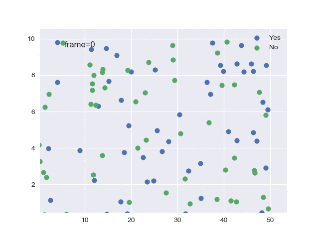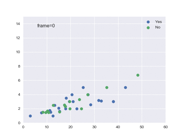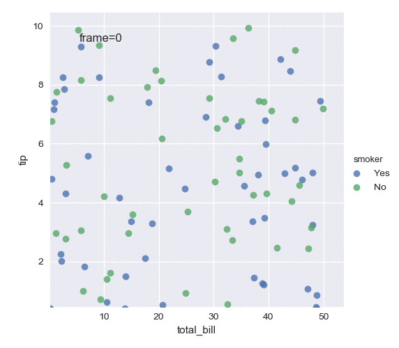 ani = matplotlib.animation.FuncAnimation(fig, animate, fargs=(tips, "total_bill", "tip", 'smoker'), frames=10, blit=True)