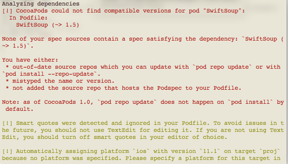 最后,经过许多努力,我成功地安装了swiftSoup ver.1.5.8。一般来说,我需要安装官方站点(pod 'SwiftSoup')中描述的经典的古代版本的pod 'SwiftSoup',在Chirag Shah的大力帮助下,我知道我需要提到我的目标,即iOS 11 (删除哈希符号并与当前的部署目标进行匹配),并且我需要通过荚update命令更新我的旧世界吊舱。就是这样。但是,当我插入命令pod更新并出错时,出现了一个问题: