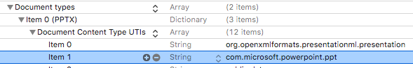 UIDocumentPickerViewController中选择pptx文件,则不需要在plist文件中添加任何内容!!只需在您的选择与documentTypes:["org.openxmlformats.presentationml.presentation"]最后,一些评论: