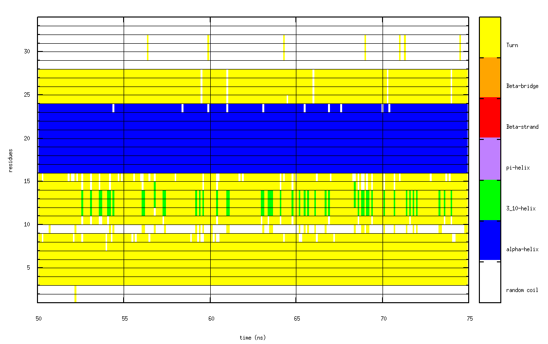 这表明,随着时间的推移,肽/蛋白质的每一个残基都有二级结构分配。所以,在每一个时间步骤(列),你看到的是单个肽的二级结构分配。对于每一个残余物(行),您将看到该残余物的二级结构分配随时间的变化。