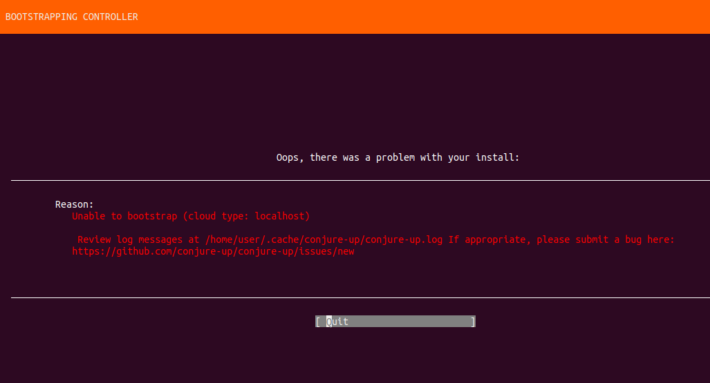 2018-07-25 20:09:38,125 [ERROR] conjure-up/canonical-kubernetes - events.py:161 - Unhandled exception in <Task finished coro=<BaseBootstrapController.run() done, defined at /snap/conjure-up/1015/lib/python3.6/site-packages/conjureup/controllers/juju/bootstrap/common.py:15> exception=BootstrapError('Unable to bootstrap (cloud type: localhost)',)>但这并没有多大帮助。