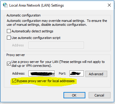 在配置代理服务器时,我忘记启用选项“本地地址的旁路代理服务器”,这将导致上述错误。