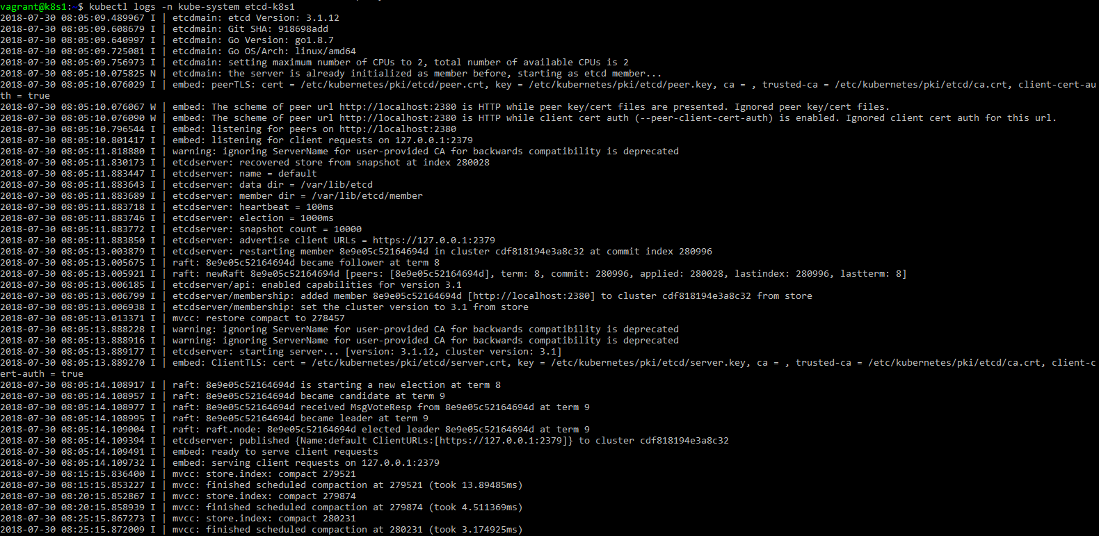 在测试上面的命令时,我使用了kubeadm版本1.11.1,它在运行Ubuntu18.04的服务器上安装了3.2.18版本的etcd。
