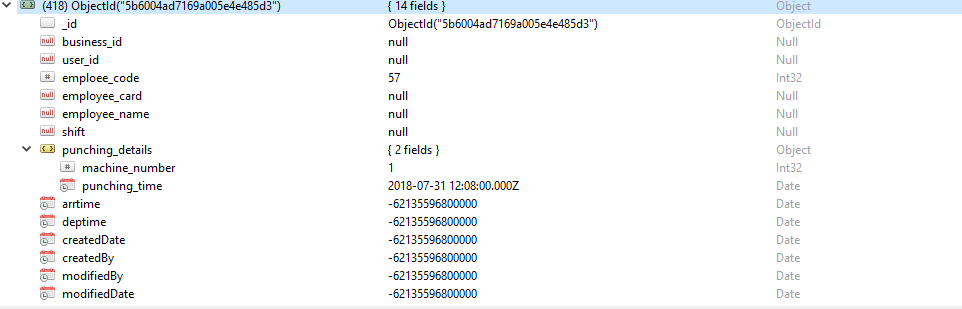 我将推荐使用不同模型的冲压细节,并使用mongodb ObjectId作为冲床模型的参考。您也可以在每次更新时创建Array并追加新文档,但是当数组太大时会导致性能问题。因此,您可以使用Punching_detail模型,如下所述
