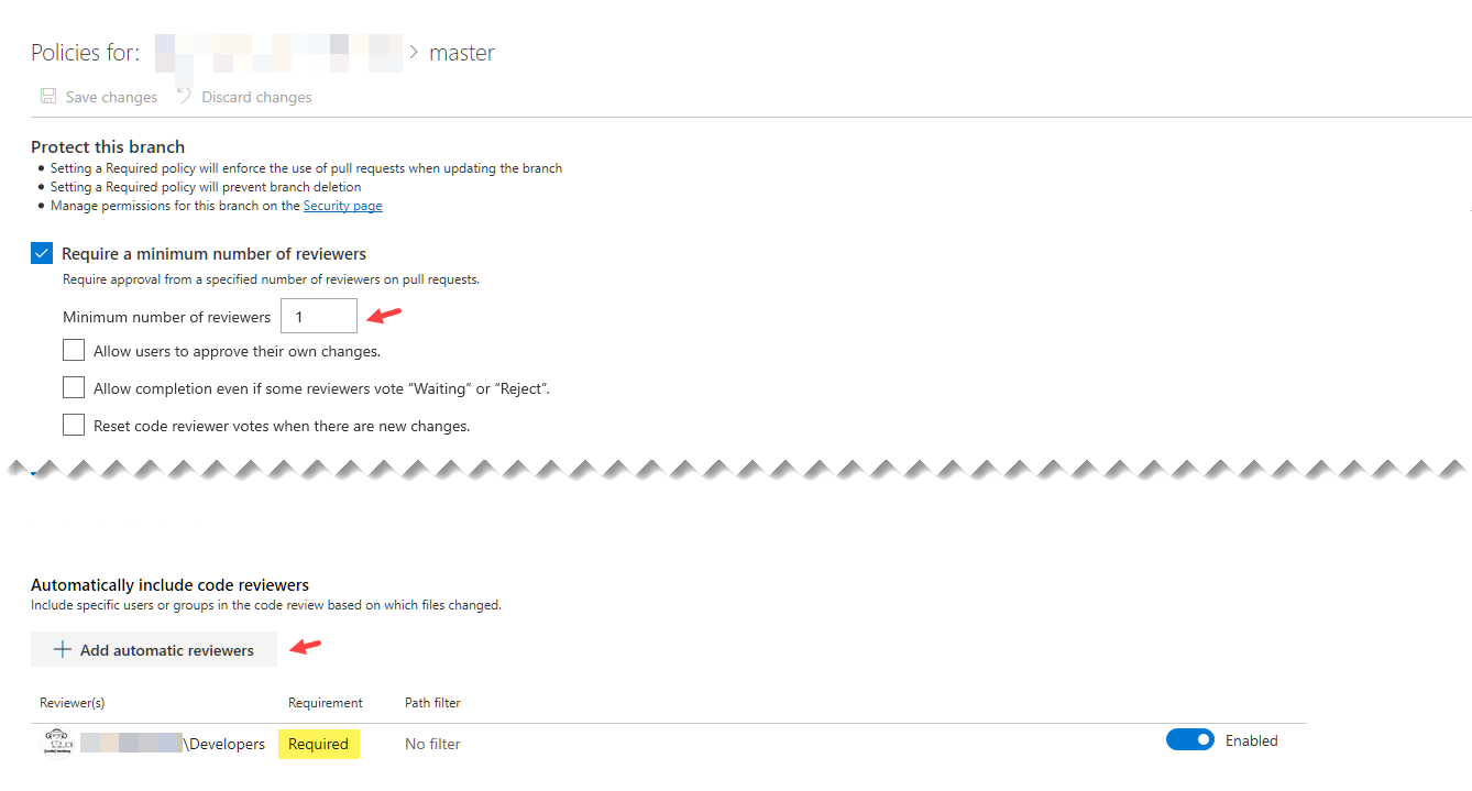 这样,至少有1人来自提供的组(在本例中为Developers)必须批准一个公关。如果需要,还可以提供路径筛选器,仅要求对某些更改进行检查,或者为文件或文件夹分配不同的组。