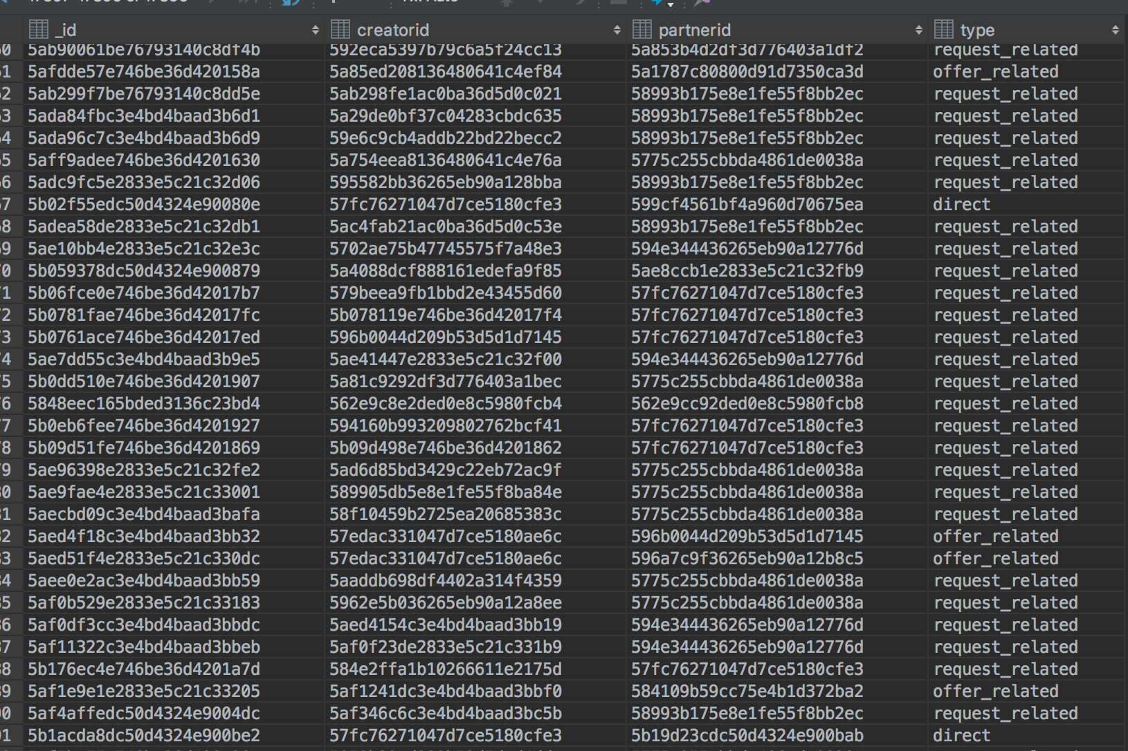 _id是聊天线程的ID。creatorid是创建聊天线程的用户的ID。partnerid是接收聊天消息的用户的ID。type是聊天的类型。我感兴趣的是,与另一个用户有2种类型的(either offer_related or request_related) and direct聊天的用户数量。