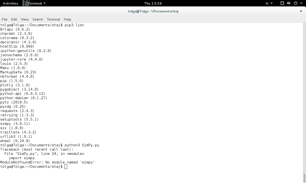 首先,我搜索了我的问题,但没有找到任何解决办法。我在Python中将SimPy导入为“imported”,并确保SimPy通过pip安装在我的系统上,但它仍然无法导入。我还添加了图片,显示了pip列表的输出和我尝试运行脚本的结果。