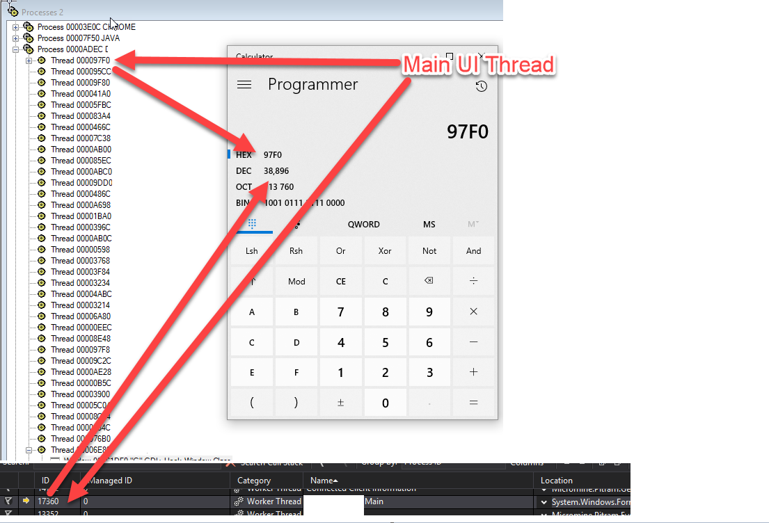 我能看到两个有窗户的线程。查看我同时执行的内存转储,以便匹配线程did ),这两个线程都只是未命名的工作线程(在窗口中看不到主UI线程)。