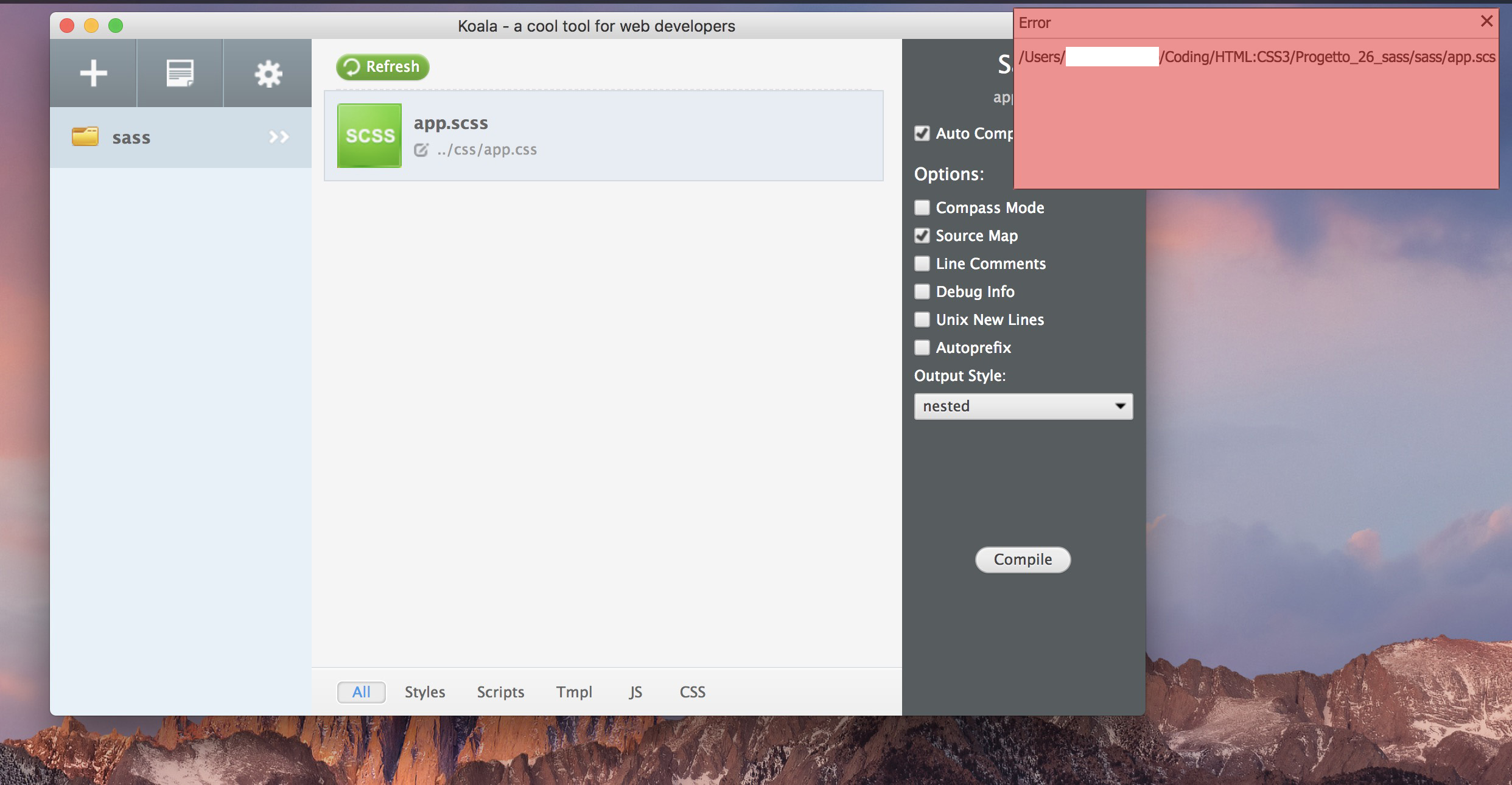 在10分钟时,他用Koala编译了一个.scss文件,一切都很好,当我这样做时,我得到了以下错误: