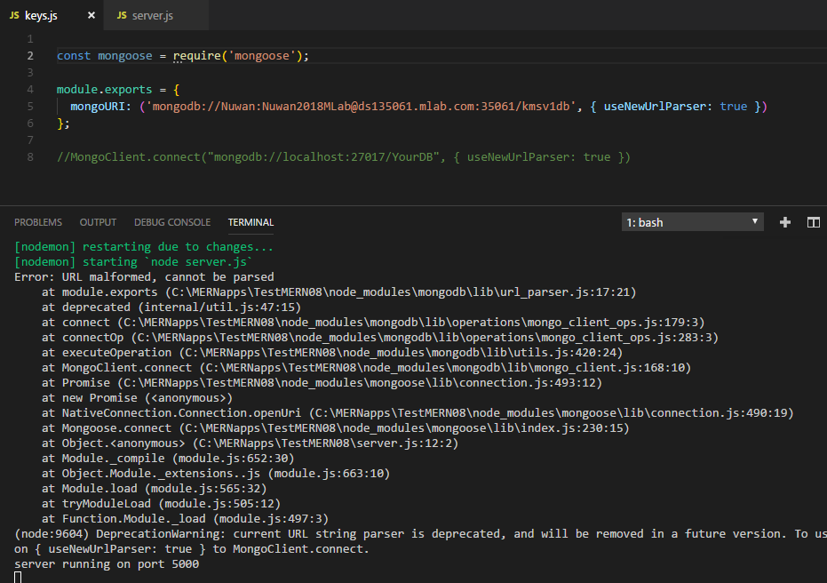 (node:3696) DeprecationWarning: current URL string parser is deprecated, and will be removed in a future version. To use the new parser, pass option { useNewUrlParser: true } to MongoClient.connect.