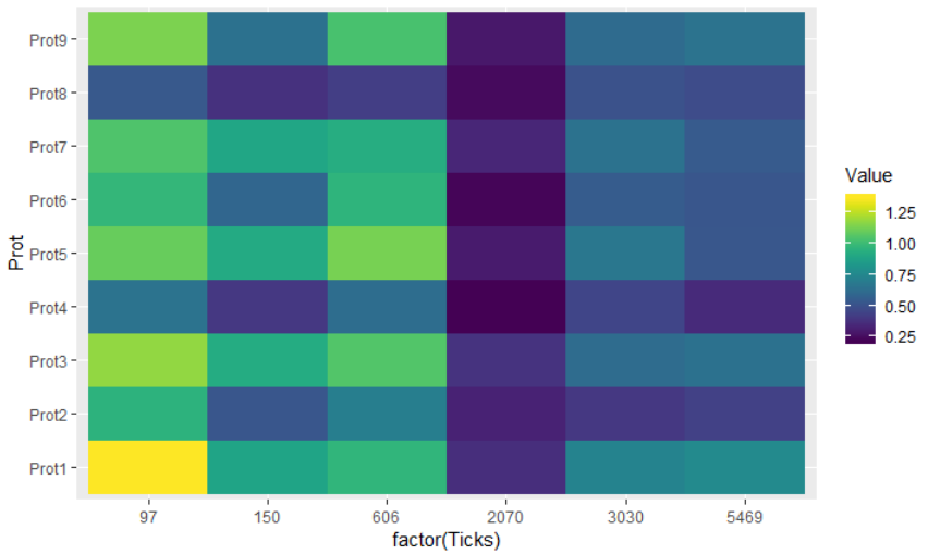 TL;DR:绘制一个热图,其中一个变量(滴答)从6到5000,另一个变量(Prot1到Prot9)上升到1.5。