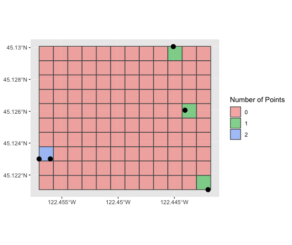 # convert grid to sf (not sfc) and add an id column grid.sf <- st\_sf(grid.100) grid.sf$id <- 1:nrow(grid.sf)# find how many points intersect each grid cell by using lengths() to get the number of points that intersect each grid square