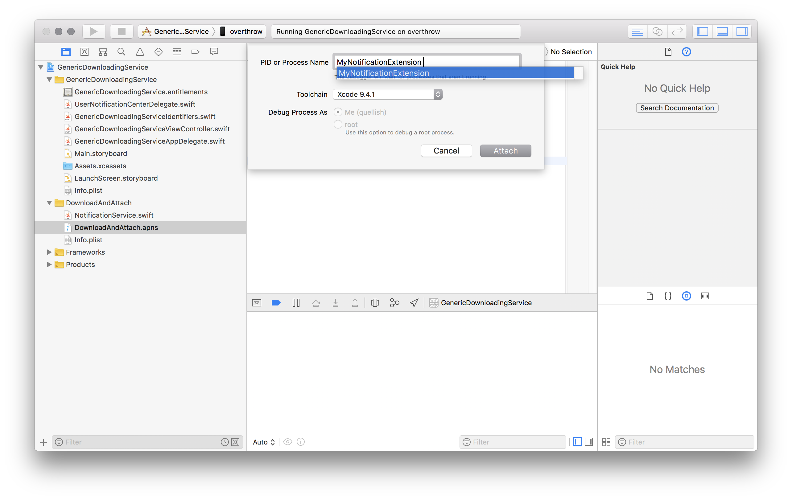 调试通知扩展与调试应用程序不同。扩展是应用程序外部iOS进程的插件。仅仅设置断点并不是调试它们的可靠方法。相反: