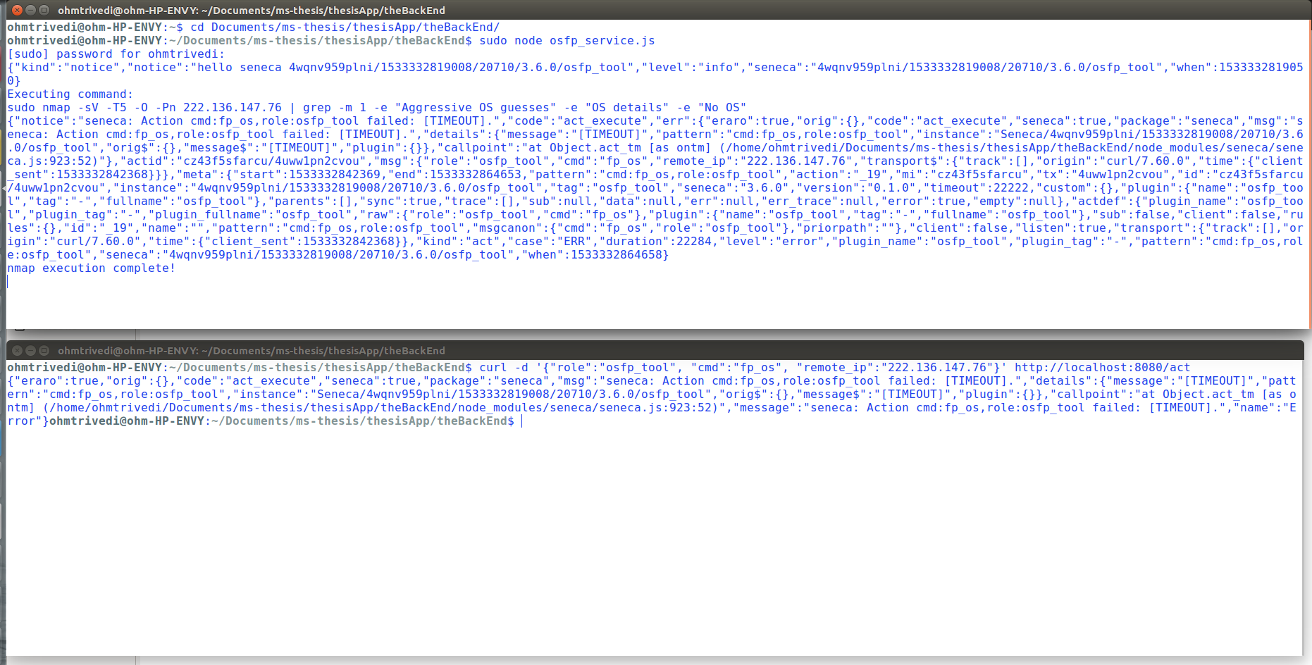编辑所以,我一直在玩超时配置。我能够解决osfp_service.js脚本中的超时错误,方法是在最顶层(服务-js-L8)设置seneca实例中的超时。