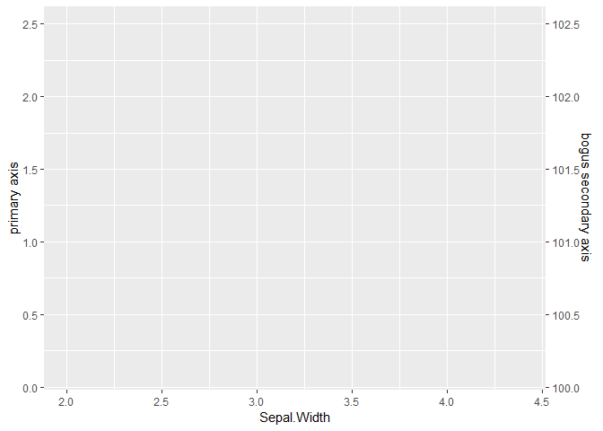 (虹膜,aes(x=Sepal.Width,y= Petal.Width)) + scale_y_continuous(sec.axis = sec_axis(~.+100),name =“伪二轴”,位置=‘右’)因此,scale_y_continuous()的附加参数将应用于主轴,而不是次要轴。如果我只是复制主轴,一切都按预期工作: