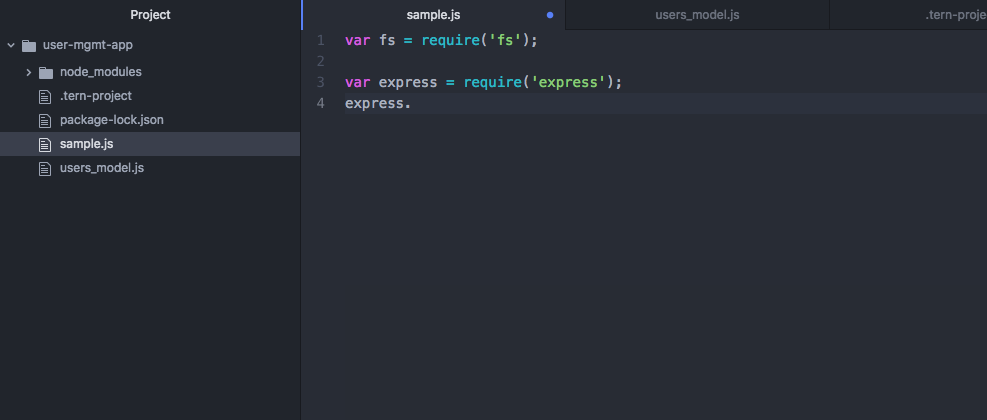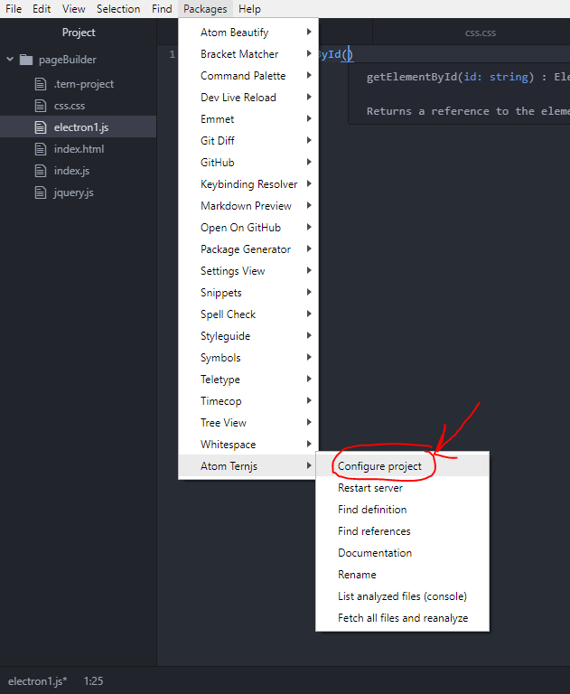 我已经安装了Ternjs包,用于在Atom编辑器中为javascript提供自动完成功能。还通过包-> Atom Ternjs ->配置项目在我的项目中启用了此功能。