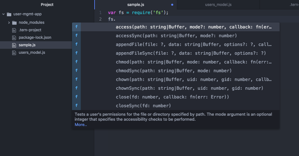 }下面的屏幕截图显示了自动完成节点js内置模块的工作。我使用了文件系统模块
