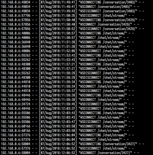 我从https://github.com/andrewgodwin/channels-examples/tree/master/multichat为大约50个用户运行代码。
