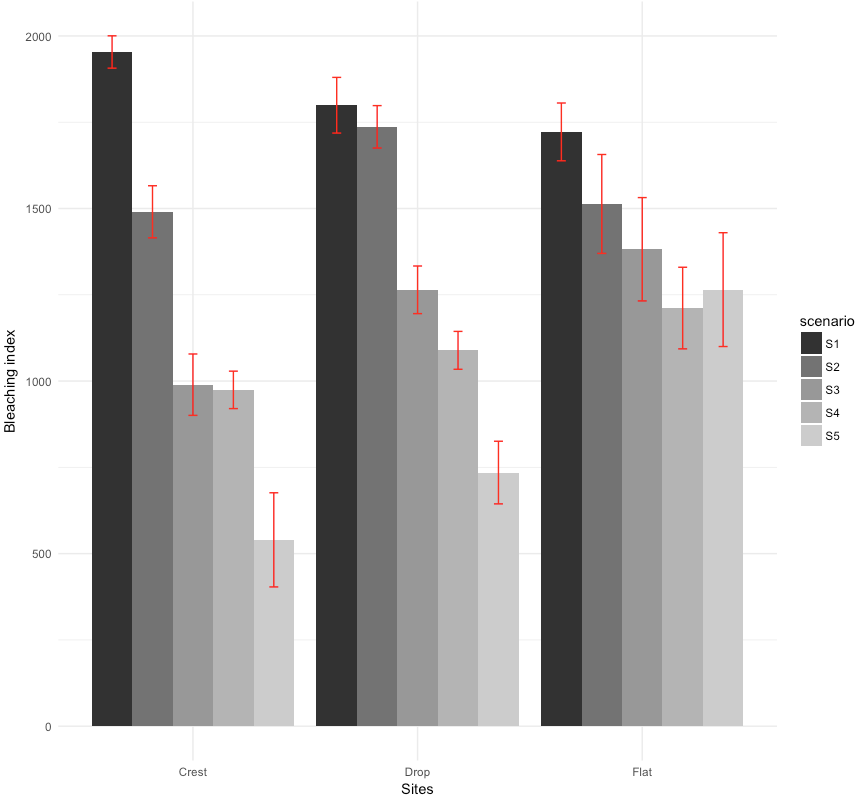 ylab("Bleaching index") + xlab("Sites") + labs(fill = "scenario") + scale_fill_grey() +