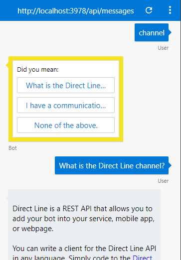 我在这个github问题中发现了同样的问题:根据输入获得排序结果的能力不起作用,正如JonathanFingold所建议的,我们可以在bot代码中使用QnA maker服务,然后根据从QnA maker服务返回的匹配问题数量向用户发送不同的响应活动。