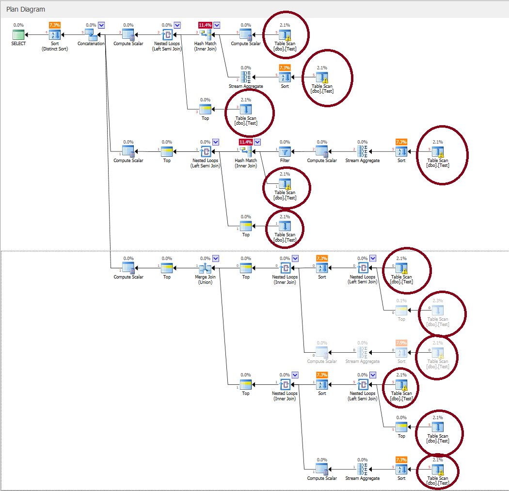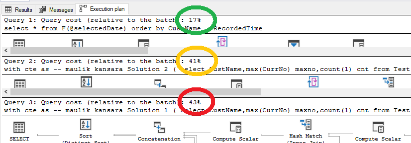 首先,根据三个查询的执行计划比较资源使用的百分比:(1)我的解决方案,(2)更新第一个解决方案后的maulik kansara解决方案,(3) maulik kansara第一个解决方案