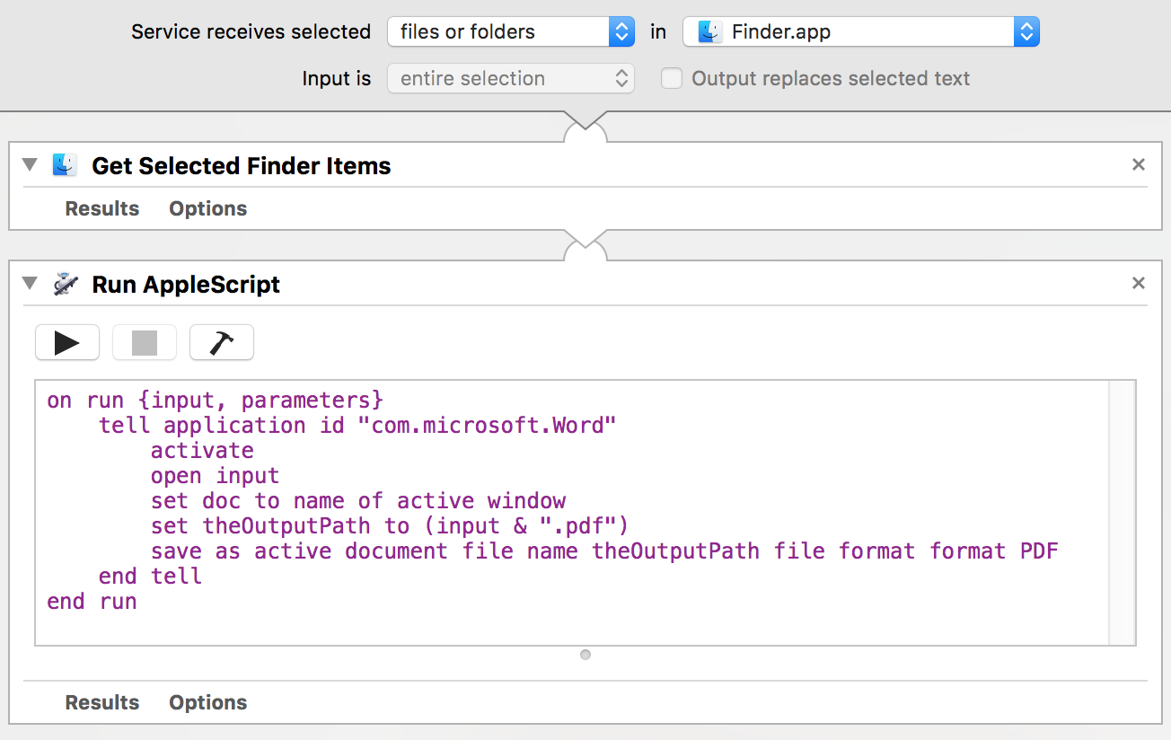我想使用Automator自动Word 2016转换一个选择的docx文件为pdf。