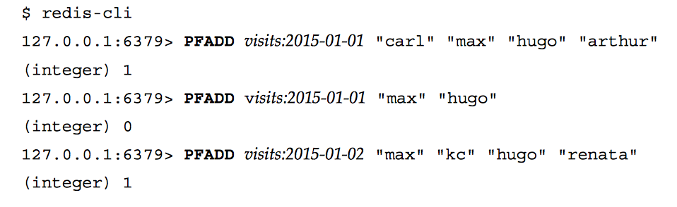 127.0.0.1:6379> PFADD visits:2015-01-01 "carl" "max" "hugo" "arthur"