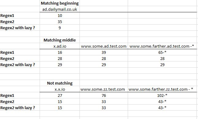 缺点是,对于任何“非广告”urls,可能会变得更糟(0-2额外步骤)。它还将取决于它是否匹配。如果不匹配,则两个正则表达式具有相同的步骤。如果他们匹配,它可能有1-2个额外的步骤。