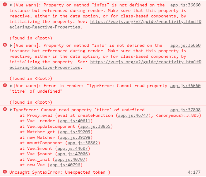 我的控制台显示了一个关于我的变量的反应性问题:infos和info。