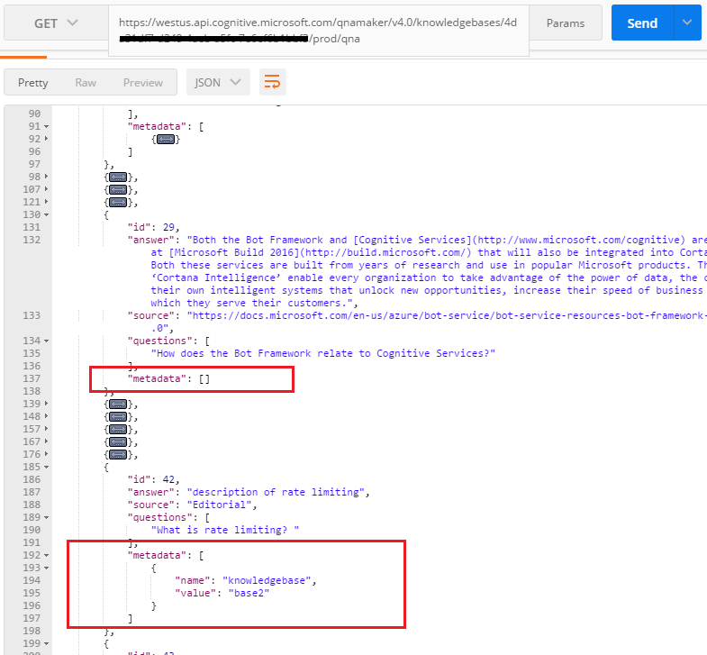 如果您检查QnA Maker REST V4.0文档,您会发现它使我们能够使用下载知识库方法下载指定知识库的内容,并且可以在指定的知识库中获取所有Q-A包括元数据详细信息的集合。