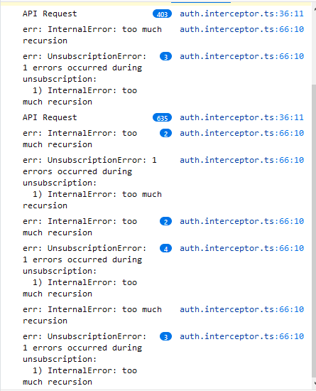 http://localhost:53448/api/...请求HttpInterceptor抓到它了。因为url与(/api\//)格式匹配,所以调用this.CheckRevogToken()方法CheckRevogToken()中,您将创建一个听者,并将文章发送到以下url:"http://localhost:53448/api/check_revog_token"HttpInterceptor再捕获一次。因为url再次与(/api\//)匹配,所以重复步骤2。https://stackoverflow.com/questions/51945562