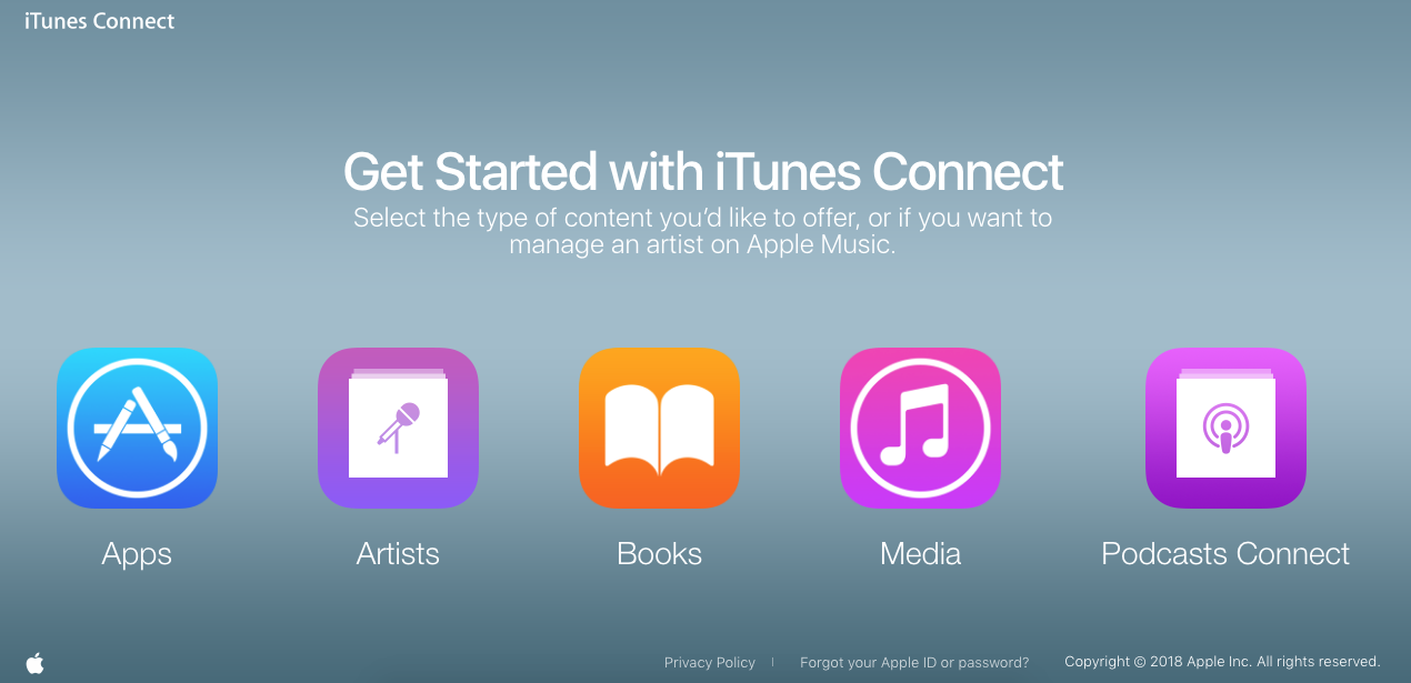 我有一个Xamarin.iOS应用程序,我正试图把它上传到TestFlight。因此,我试图添加创建一个iTunes连接记录。当我登录到iTunes连接时,将显示以下页面。
