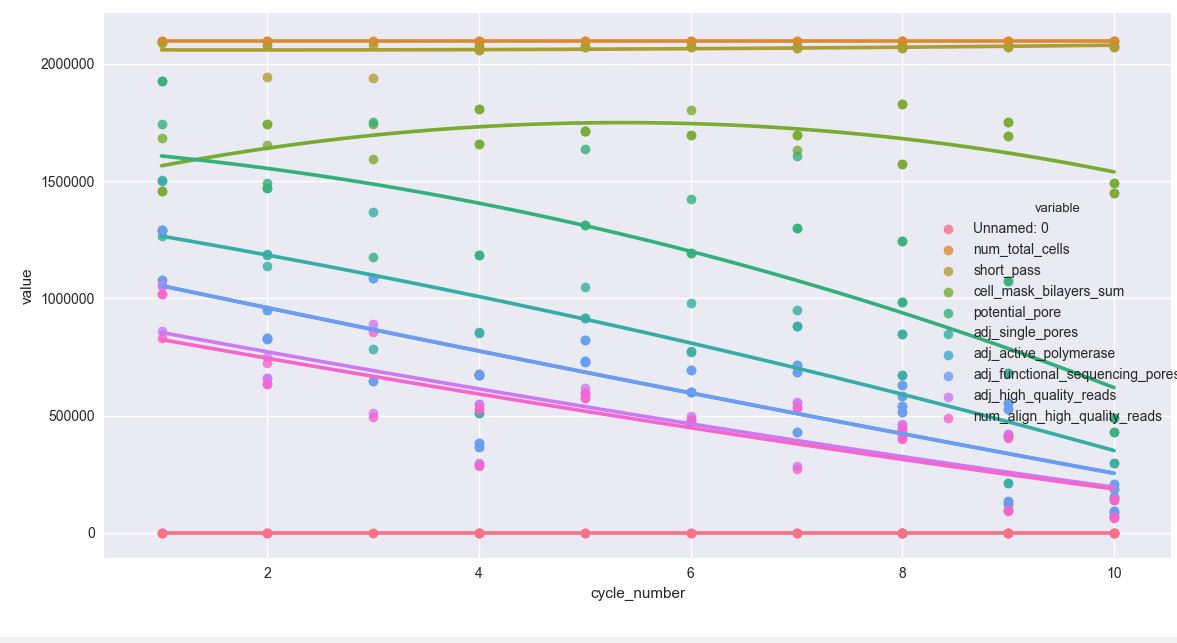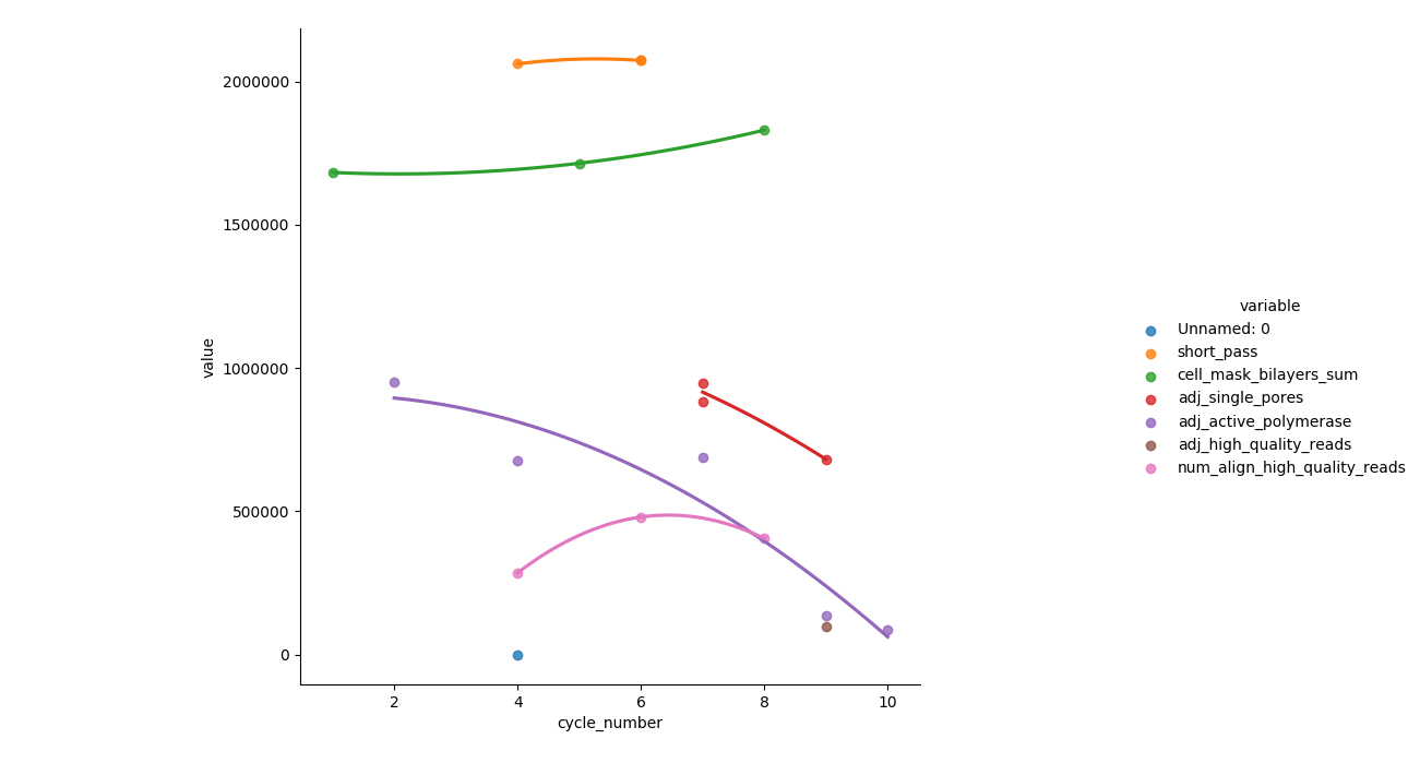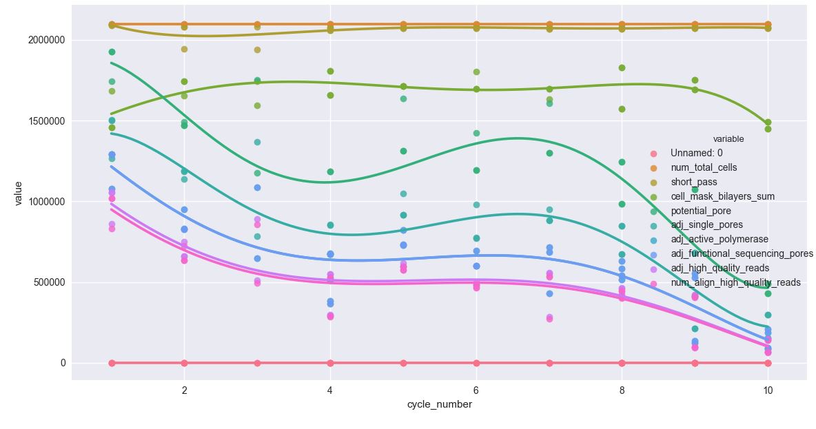sns.lmplot('cycle_number', 'value', data=df, hue='variable', ci=None, order=2, truncate=True)