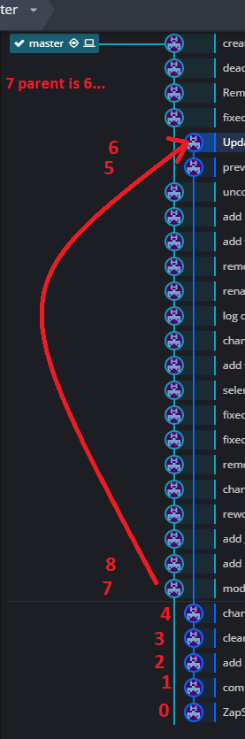 注意:数字代表创建提交时的时间顺序。以下图片中的所有提交都来自主分支。提交7父母是提交6。