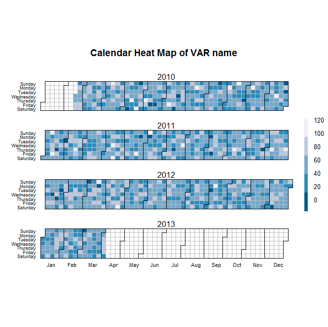 calendarHeat2(myd$date1, myd$heatvar, varname="VAR name", ncolors=5, color="w2b")