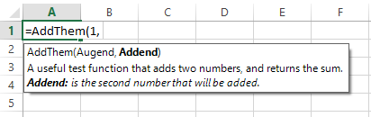 }当我转到Excel时,函数可以工作,但是说明和所需的参数也没有显示出来。我怎么才能让他们表现出来?