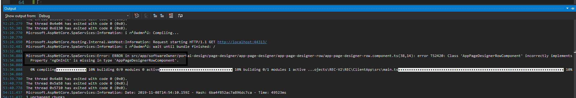 这基本上是你的角度应用程序中的一个错误。您可以检查Visual中的"Output“窗口,该窗口显示准确的错误消息。