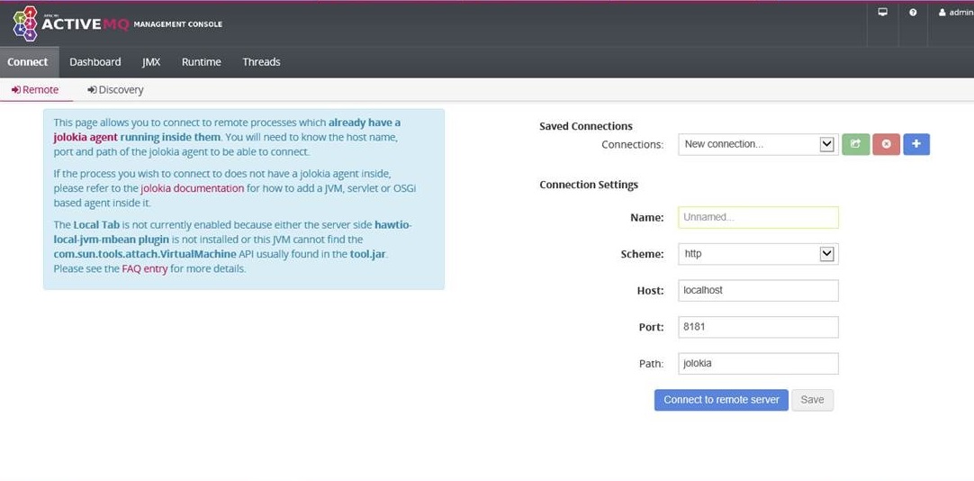 artemis (或任何您想要的名称)http或https (取决于您的配置)localhost (在服务器上)或ip/servername8181 (取决于您的配置)console/jolokia (取决于您的配置)单击Connect to remote server打开仪表板。要查看接收方/地址的详细信息,请导航到JMX / org.apache.activemq.artemis。