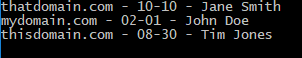 最终的目的是用这些信息填充一个表,这样我就可以知道哪个域更新日期即将到来,这样我就可以手动向客户发送一张发票。我不认为有必要加上这一年,因为每当确切日期过去时,我都要更新它。