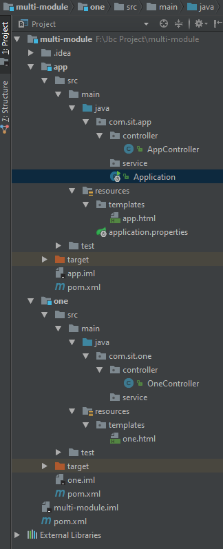 解决方案是确保com.sit:one模块是com.sit:app的依赖项,向应用程序模块的pom.xml中添加以下内容