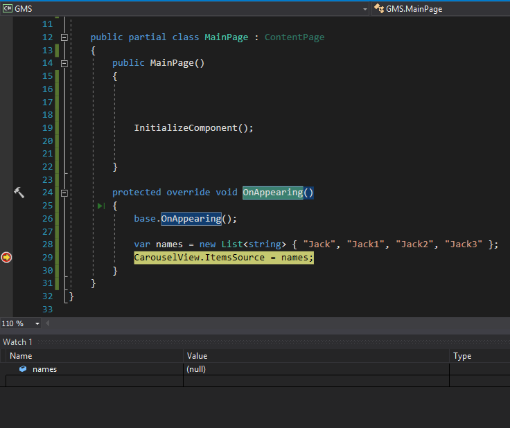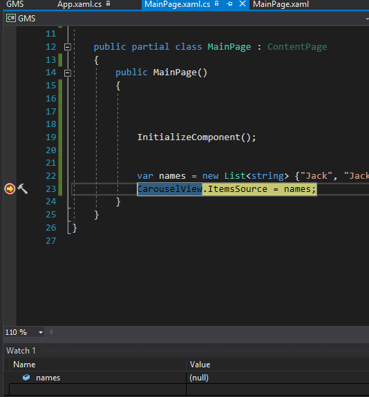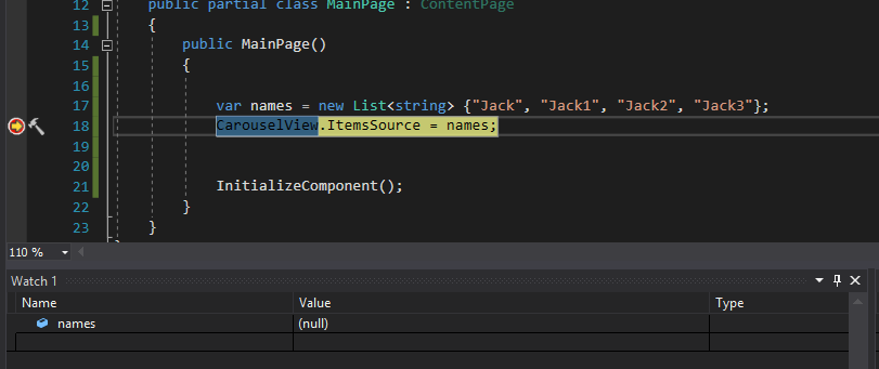 我刚开始使用Xamarin表单,但有一点奇怪,我无法理解我想要使用CarouselView控件并将名称列表设置为ItemsSource。