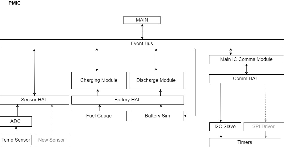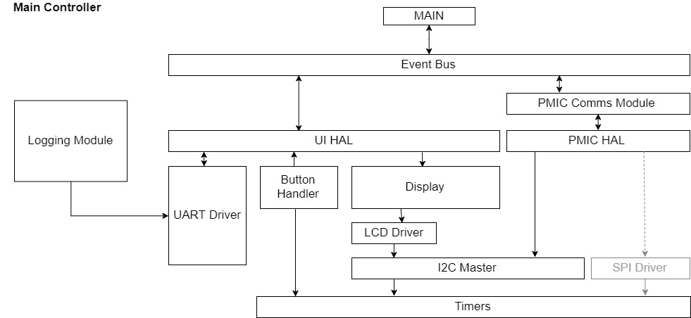 现在我要做的是想出一个良好的固件架构,允许扩展性(增加多个电池、增加更多传感器、将液晶(或其他)接口从I2C更改为SPI等),以及用于测试(通过UART模拟按钮按下,用模拟值替换电池读数来测试PMIC充电固件等)。