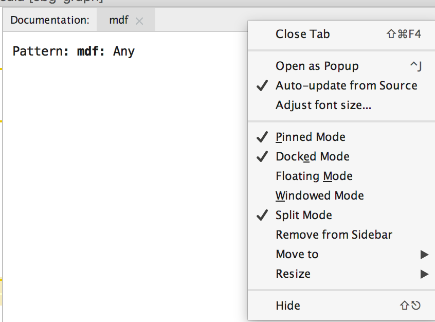 当我单击标识符上的Option-Q以显示Quick-Documentation Popup,而不是显示在标识符上方的一个小对话框中时,它将显示在左边的一个大的单独面板中。