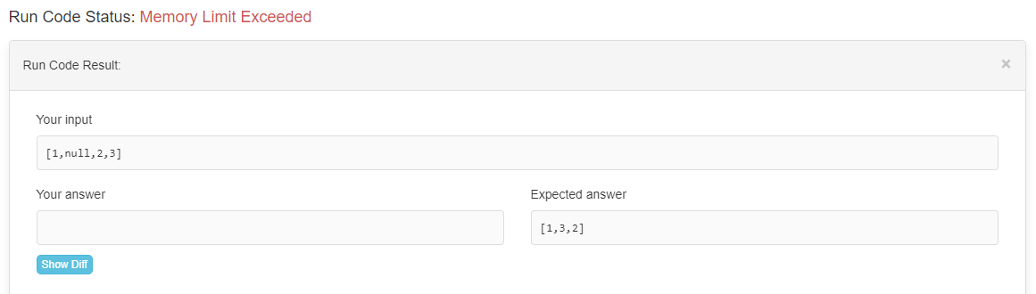 下面的代码按照顺序执行二进制树遍历。当我在Leetcode中执行它时,我会收到一个Run Status Code: Memory Limit Exceeded。有人能解释一下是什么导致了这个错误吗?