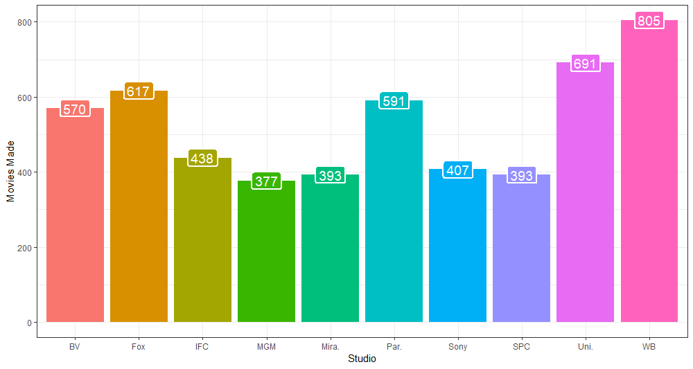 ggplot(aes(x = studio, y = movies_made, fill = studio, label = as.character(movies_made))) +