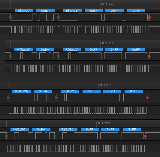 Dim res As Boolean = CH341StreamI2C(0, wLen, writeBufPtr, rLen, readBufPtr)我使用逻辑分析器来查看SDA和SCL行上的内容。结果是不可预测的。例如,如果调用前面的代码4次,结果是: