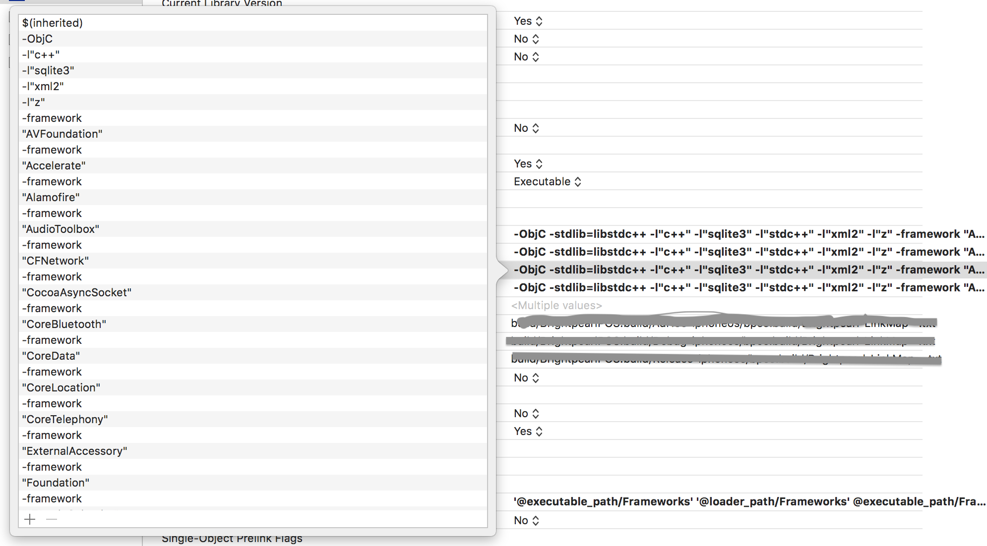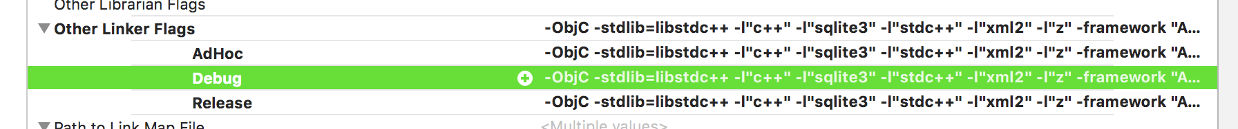 该项目在Other Linker Flags中没有设置任何设置。目标的Other Links Flags摘要包括-stdlib=libstdc++
