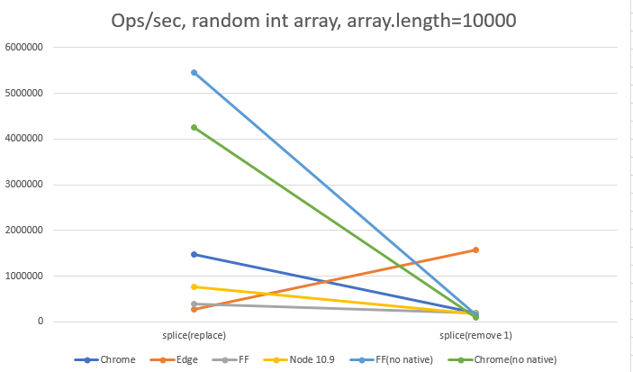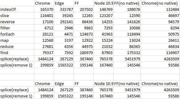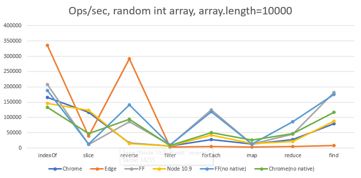我正在调优我的库好核,并设置一些性能测试来与本机数组函数进行比较。然后我在笔记本电脑上与Edge、FF、Chrome和Node 10.9进行了比较。当然,我的lib结果好坏参半,但更有趣的是,浏览器之间的差异有时是最佳浏览器和最差浏览器的30倍,而且在不同的操作之间似乎并不完全不同。