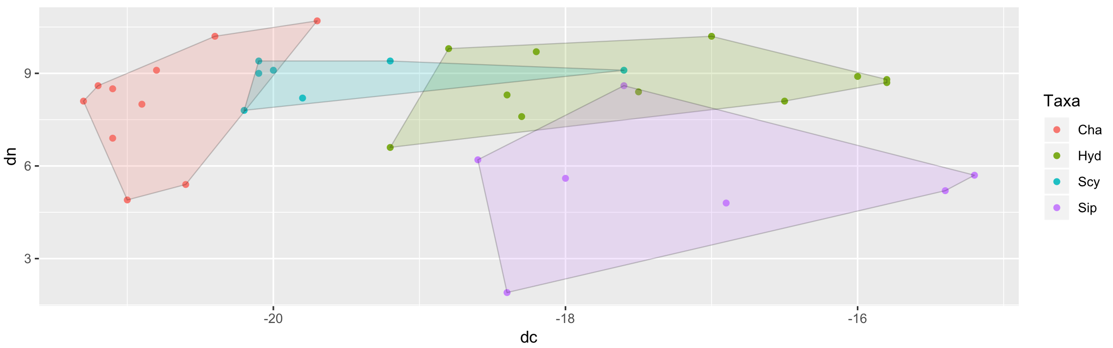 geom_polygon(data=chulls, aes(x=dn, y=dc, fill=Taxa, alpha=0.2))
