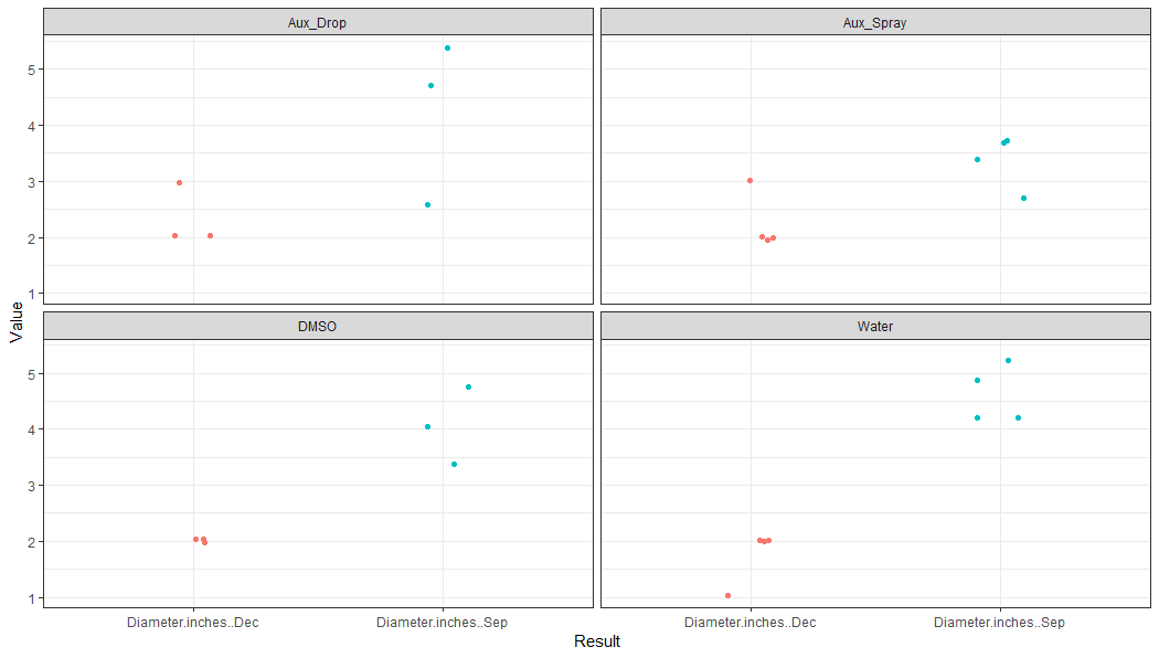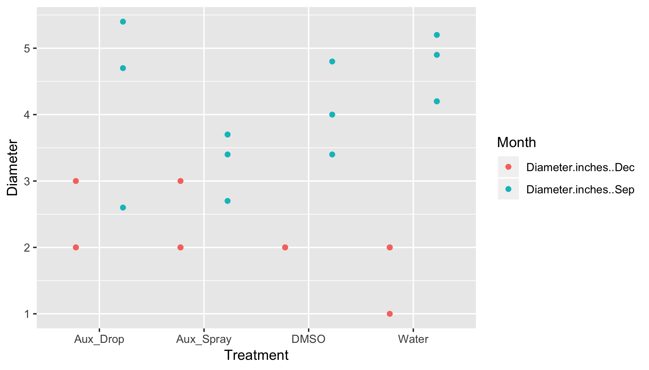 然而,,我想在每个不同颜色的治疗方法中,在“九月直径”旁边加上“12月直径”的散点图。我无法找到一个可行的例子,到目前为止,我还不能用它来实现我的目的。